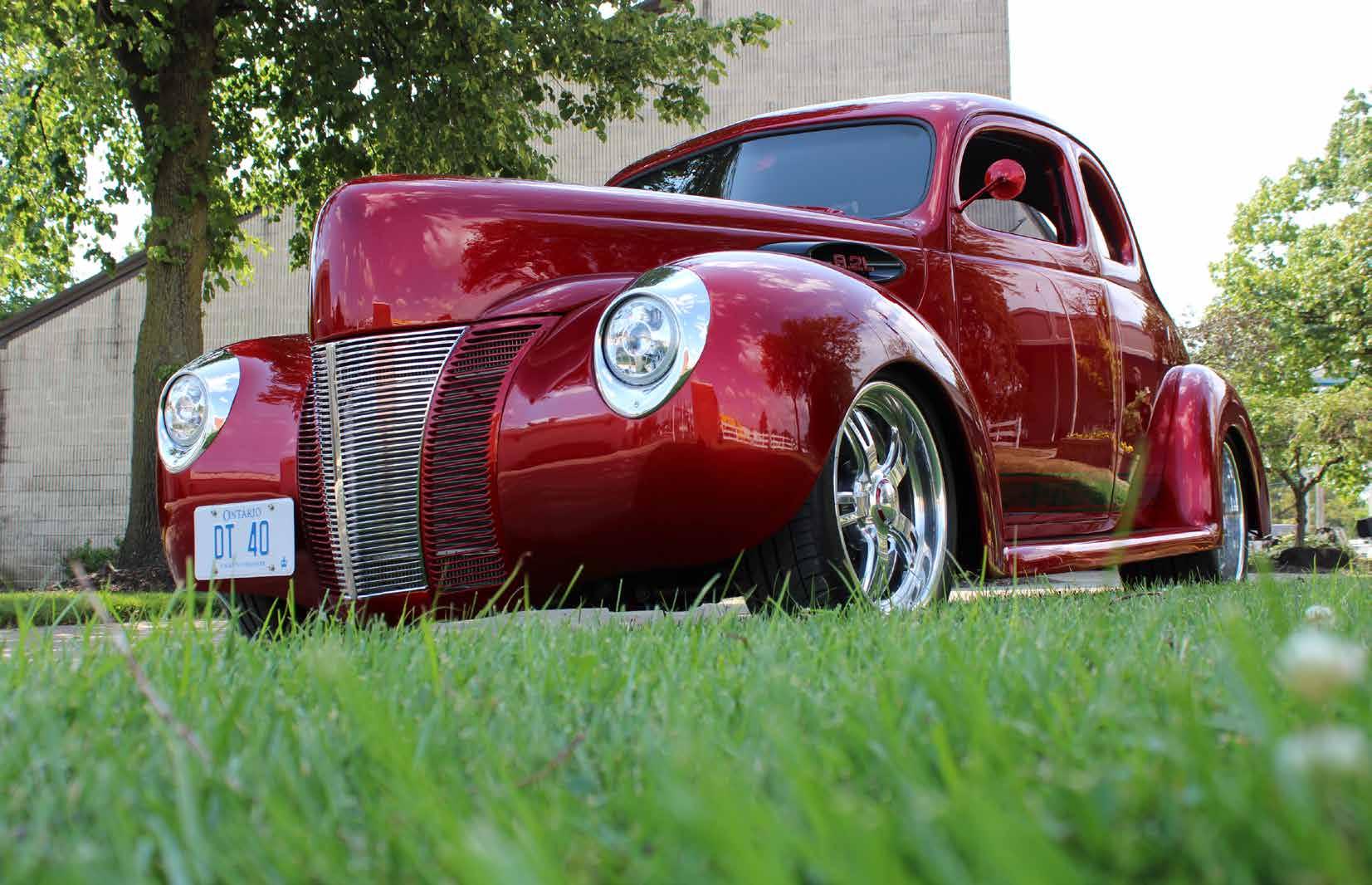We all have a reason for being hotrod obsessed, for some it is just playing with hotwheels or models as a kid or some it is relatives or neighbors influence and for some it is the culture we grew up in such as tv or movies. I am sure American Graffiti, Gone is 60 Seconds and Smokey and the Bandit have lured many a kid into the car coolness. For Doug Thompson it was a movie with a ‘40 Ford drag racing and he had to have it. When he was 19 years old he found one in a barn and spent weeks convincing an old guy to sell it to him. Doug and his pal Dave worked on their cars together but life got in the way. It seems like I hear that about every car. Fast forward to 2009 and Doug finally got the car to John at Dream Machines in Scarborough, ON. After 4+ years Doug took it to the Motorama car show. It was put on display in the grand hall as you walked in and the 1940 Ford Coupe was selected as one of the top 10 cars in the entire show as well winning best in class interior and best paint. The whole car is incredible but the paint is what gets you first, House of Kolor Meteor Maroon II with Apple Red Kandy and Kosmic Acrylic Show Klear. Kandy paint is the ultimate but really hard to do and extra hard to take care of, any repair cannot easily be matched.