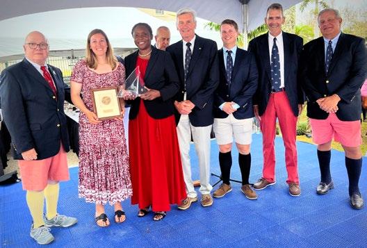 Chris Lewis, Stan Honey, Sally Honey, Chris Sheehan, and Charles Swanson representing two division winners share a moment with their trophies. Sally Honey holds the St. David’s Lighthouse Trophy for Illusion and Chris Sheehan holds the Gibbs Hill Lighthouse Trophy for Warrior Won continued on page 6