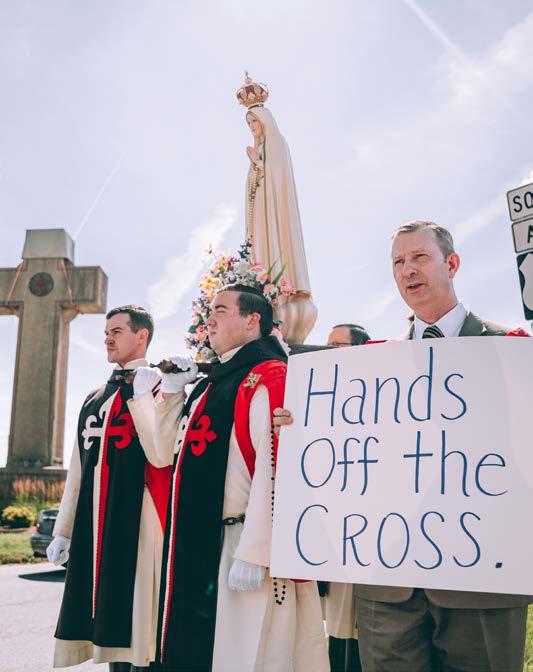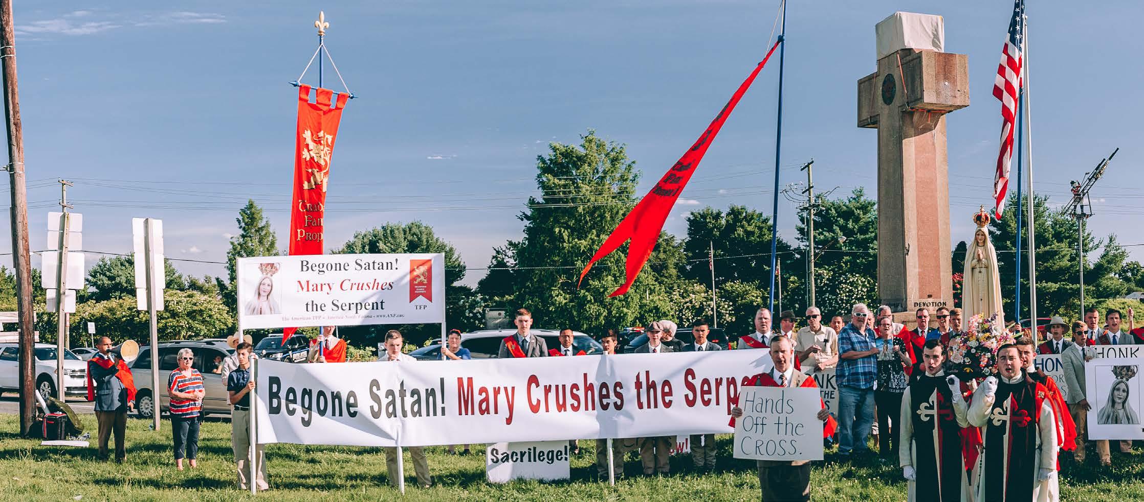 The American Society for the Defense of Tradition, Family and Property (TFP) and its America Needs Fatima campaign organized a rosary rally in protest of and in reparation for the satanic act. Approximately 120 faithful gathered to stand by the cross. At the head of our formation was Our Lady of Fatima on a litter carried by four young TFP members in full ceremonial garb. Next to them stood the president of the American TFP, Mr. Raymond Drake. Up along the road to the right were a mixture of people. Some were elderly who remained standing despite their age. Some were young TFP Student Action South caravan volunteers from as far away as Texas, Colorado and Illinois, who have spent the summer campaigning for God’s cause. Others were children who happily held a sign asking people to “Honk for the Cross.” There was a grandfather, accompanied by his children and grandchildren, who refused to drink water as an act of sacrifice. There was a girl who is battling cancer, who despite her fatigue insisted upon driving from Ohio to be there. There was the TFP band, alternating between playing Marian hymns on their drums and bagpipes, and shouting the prayers loudly through megaphones. Everyone stood by the cross with a rosary in hand and prayer in their mouths.