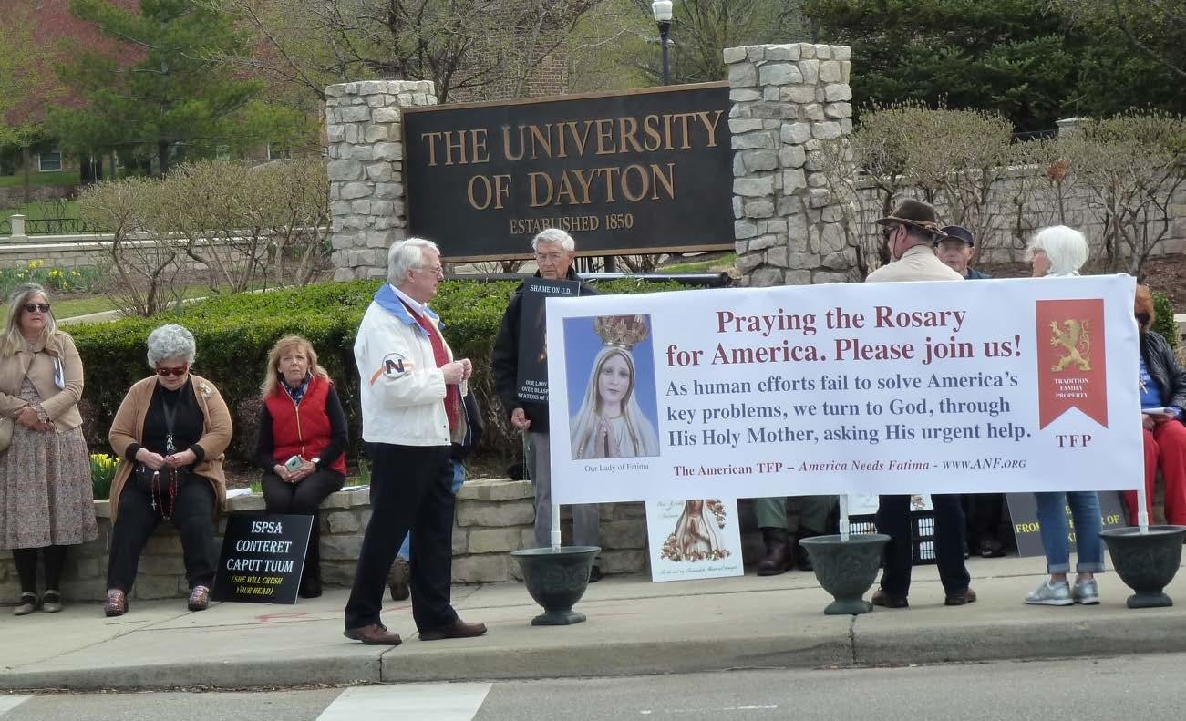 My wife and I were asked by America Needs Fatima to host a rosary rally of reparation at the University of Dayton (UD) in response to the blasphemies the university was promoting against the Passion, Death and Resurrection of Our Lord. The offensive “LGBTQ Stations of the Cross” there twist the true meaning of Our Lord’s sacred Passion, in what the university says is its attempt to make LGBTQ students feel included or accepted on the Catholic campus.
