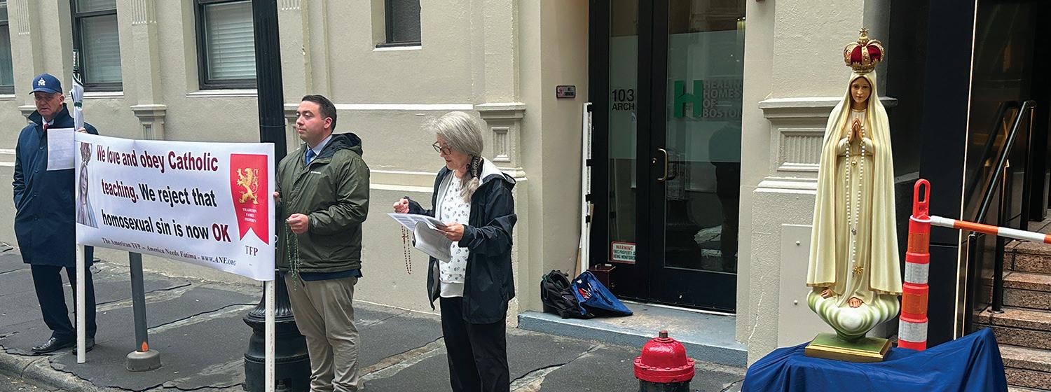 Our TFP-ANF friends decided to hold the rally to make reparation against the shrine announcing this immoral ministry on their website, which is described as “a welcoming and affirming group for lesbian, gay, bisexual, transgender and queer Catholics to explore, share and celebrate their faith.”