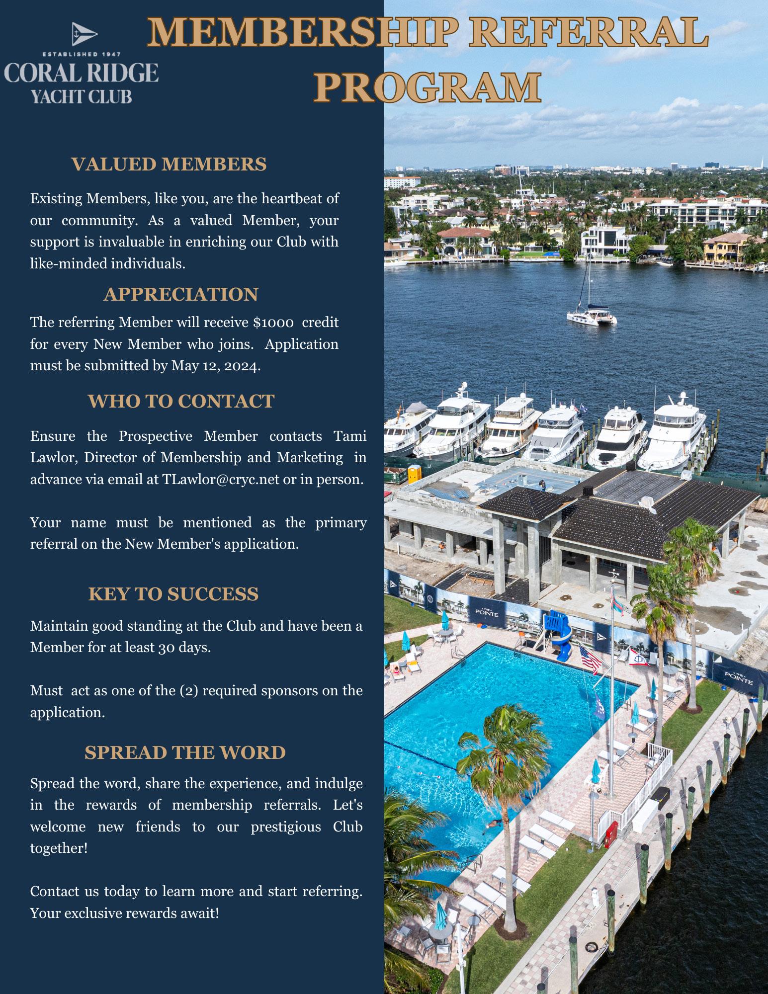 Many thanks to those members that have referred New Members to CRYC. Our expected growth with the opening of “The Pointe” will allow us to increase joining fees in the future and determine when we should pause adding additional members.