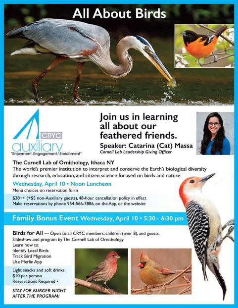 Our April 10th Auxiliary Luncheon, another exciting event, will feature Catarina Lopes Massa, of the Cornell Lab of Ornithology, in Ithaca, NY. Her talk, “All About Birds,” will include those in our local area. Later that same day, at 5:30 pm, she will speak again at an Auxiliary and Family Bonus Event, which will be open to all Members, children aged eight and up, and guests.