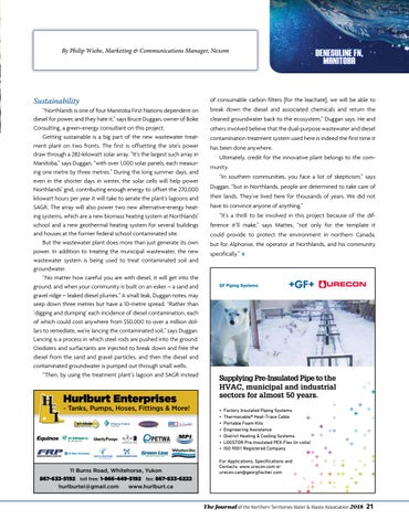 break down the diesel and associated chemicals and return the “Northlands is one of four Manitoba First Nations dependent on cleaned groundwater back to the ecosystem,” Duggan says. He and diesel for power, and they hate it,” says Bruce Duggan, owner of Boke Consulting, a green-energy consultant on this project. others involved believe that the dual-purpose wastewater and diesel Getting sustainable is a big part of the new wastewater treatcontamination treatment system used here is indeed the first time it ment plant on two fronts. The first is offsetting the site’s power has been done anywhere. draw through a 282-kilowatt solar array. “It’s the largest such array in Ultimately, credit for the innovative plant belongs to the comManitoba,” says Duggan, “with over 1,000 solar panels, each measurmunity. ing one metre by three metres.” During the long summer days, and “In southern communities, you face a lot of skepticism,” says even in the shorter days in winter, the solar cells will help power Duggan, “but in Northlands, people are determined to take care of Northlands’ grid, contributing enough energy to offset the 270,000 their lands. They’ve lived here for thousands of years. We did not kilowatt hours per year it will take to aerate the plant’s lagoons and have to convince anyone of anything.” SAGR. The array will also power two new alternative-energy heat“It’s a thrill to be involved in this project because of the difing systems, which are a new biomass heating system at Northlands’ school and a new geothermal heating system for several buildings ference it’ll make,” says Mattes, “not only for the template it Tanks, Pumps, Hoses, More! and houses at the former federal school contaminated site. Fittings & could provide to protect the environment in northern Canada, But the wastewater plant does more than just generate its own but for Alphonse, the operator at Northlands, and his community power. In addition to treating the municipal wastewater, the new specifically.” S wastewater system is being used to treat contaminated soil and groundwater. “No matter how careful you are with diesel, it will get into the GF Piping ground, and when your community isDistributor built&onMore! an esker –for a sand and Trusted Yukon Projects of All Systems Kinds Tanks, Pumps, Hoses, Fittings Tanks, Pumps, Hoses, Fittings & More! Tanks, Pumps, Hoses, Fittings & More! gravel ridge – leaked diesel plumes.” A small leak, Duggan notes, may ks, Pumps, Hoses, Fittings More! Hoses, Fittings & More! s,Pumps, Pumps, Hoses, Fittings &&More! Tanks, Pumps, Hoses, Fittings & More! mps, Hoses, Fittings & More! Pumps, Hoses, Fittings More! seep down three metres but have a 10-metre spread. “Rather than Pumps, Hoses, Fittings &&More! Tanks, Pumps, Hoses, Fittings & More! Tanks ‘digging and dumping’ each incidence of diesel contamination, each Year Round Service: Pumps of which could cost anywhere from $50,000 to over a million dolCamps, Mines, Commercial & Hose lars to remediate, lancing the contaminated soil,”Residential says Duggan. Projects Across the North. Pipes &we’re Fittings ® LancingDistributor is aInfiltrator process inChambers which steel rods are pushed intoKinds the ground. usted Yukon for Projects of All Trusted Yukon Distributor for Projects of All Kinds Irrigation Oxidizers and surfactants injected to break down and free the ukon Distributor for Projects of All Kinds Distributor for Projects ofare All Kinds URT ENTERPRISES INC. U T Trusted Yukon Distributor forKinds Projects of All Kinds Water Treatment of nPumps, Distributor Distributor for Projects Projects ofKinds All All Kinds Hoses, Fittings &for More! diesel from the sand and gravel particles, and then the diesel and We Will Earn Your Satisfaction, ributor for Projects of All istributorfor forProjects Projects ofAll All Kinds Civil Environmental Products istributor of Kinds Trusted Yukon Distributor for Projects of All Kinds contaminated groundwater is pumped out through small wells. Tanks Insulation Year Round Service: s Farm & Ranch Supplies “Then, by using the Will treatment plant’s lagoon SAGR instead We Earn Your Satisfaction, Yearand Round Service: Pumps Supplying Pre-Insulated Pipe to the Tanks Camps, Mines, Commercial & Mines, Commercial & GE Water Technologies Recreation Equipment Year Round Service: Camps, Hose Round Year Service: Year Round Service: Pumps Tanks Residential Projects Across the North. HVAC, municipal and industrial & Fittings Camp Supplies & Services Camps, Mines, Commercial & Year Year Round Round Service: Service: Residential Projects Across the North. Pipes &Mines, Fittings Camps, Commercial & Camps, Year Round istributor for Projects of All KindsService: Mines, Commercial & Round Service: Year Round Service: Year ® Year Round Service: ® Pumps Year Round Service: atorHose Chambers Septic & Water Systems Residential Projects Across the North. sectors for almost 50 years. Infiltrator Chambers Camps, Camps,Mines, Mines, Mines,Commercial Commercial Commercial && Residential Projects Across the North. Camps, & Projects Across the Mines, North. Commercial & Camps, &Camps, Fittings rnPipes Your Satisfaction, Hose Mines, Commercial & & & Residential Camps, Mines, Commercial tion Fuel Tank & Containment Camps, Mines, Commercial rs Irrigation Residential Residential Projects Projects Across Across the the North. North. ® Residential Projects Across the North. Pipes &&Fittings Infiltrator Chambers Guaranteed. Residential Projects Across the Treatment Expediting Logistics Residential Projects Across theNorth. North. - Tanks, Pumps, Hoses, Fittings &Residential More! Projects Across the North.