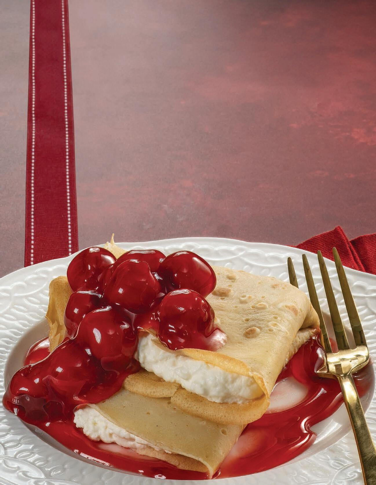 2. Make the crepes with a mixer or in a blender. Add flour, eggs, salt, vanilla extract, melted butter to a bowl or blender. Gradually, add milk gradually and mix until smooth. Heat an 8” crepe pan on stove top at medium heat and lightly butter it. Pour a ¼ cup of batter into the crepe pan and rotate the pan to spread it evenly. Cook on the first side for 2 minutes and flip and cook on the other side for about 30 seconds. Stack on a plate with parchment paper between the slices and repeat. You should have 10-12 crepes. Spread each crepe with the vanilla cream filling evenly. Fold each crepe into quarters and top with the cherry pie filling and add the whipped topping to taste.