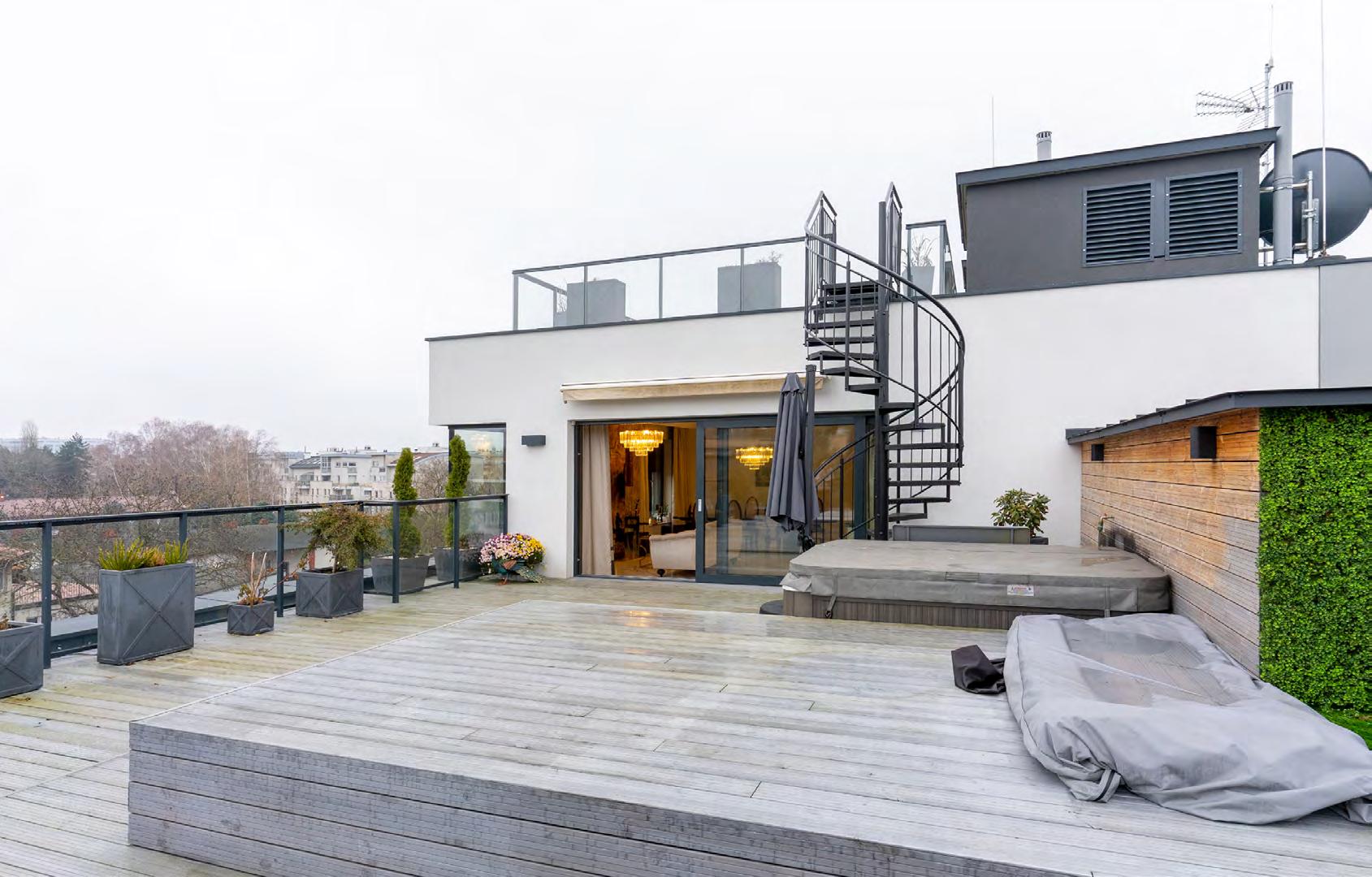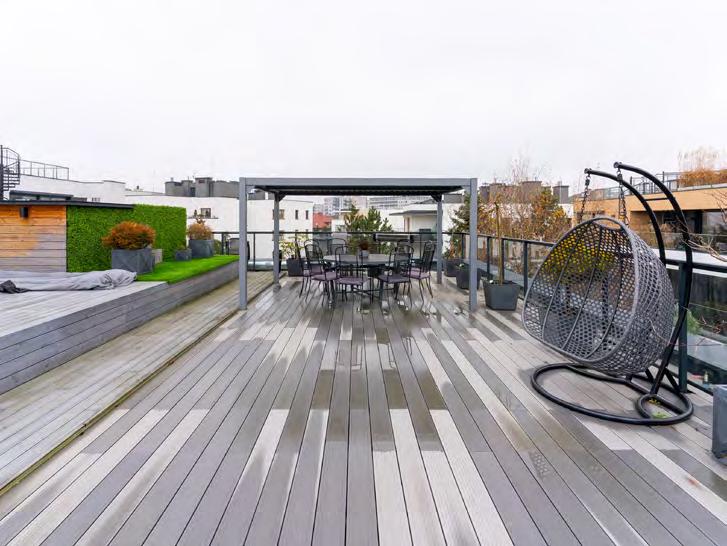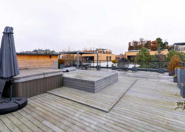 Dzięki tak dużym tarasom z uro kliwym widokiem na zieleń mo żemy poczuć się jak w domu. Na tarasie mamy jacuzzi, grill, stół z zadaszeniem, część wypoczynkową z leżakami.