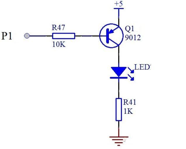 IfP1isgivenahighlevel1byourprogram,thenthebasebandtheemitter eareboth5V,thatistosay,therewillbeno0.7Vvoltagedropfrom etobAtthistime,theemitterandthecollectorwillalsoItwillnot beturnedon,sothecircuitisdisconnectedatthetriodewhenviewed verticallyIfthereisnocurrentpassingthrough,theLEDwillnotlight up.IftheprogramgivesP1alowlevelof0,thentheepoleisstill 5V,sothereisavoltagedifferencebetweeneandb,andthetransistors eandbarealsoturnedon,andthereisabout0.7Vbetweenthetransistor eandbThevoltagedrop,thenthereisavoltageof(5-0.7)Vacrossthe resistorR47.[Note]TheoutputhighleveloftheP1porthereis5V,and thehigh-leveloutputvoltageoftheIOportofdifferentsingle-chip microcomputersisdifferent.TheIOoutputofsomesingle-chip microcomputersis1.2V,whichrequirestriodeamplificationtodriveLEDs, etcWork.