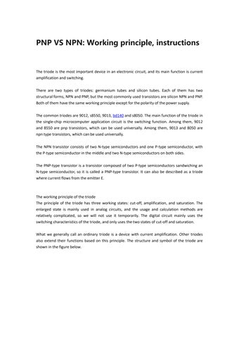 Thesmallbluewaterflowimpulseleverinthethintubeontheleftwidens thevalveofthelargewaterpipe,allowingalargerflowofredwater topassthroughthevalve.Whenthebluewaterflowislarger,thered waterflowinthelargepipeisalsolarger.Ifthemagnificationis100, thenwhenthesmallbluewaterflowis1kg/hr,thenthebigpipeisallowed toflow100kg/hrofwater.Similarly,whenthemagnificationofthetriode is100andIb(basecurrent)is1mA,acurrentof100mAisallowedtopass throughIce.Theworkingprinciplesofthetwotriodesaresummarizedas follows:theemitter(e)oftheNPNisgrounded,thecollector(c)is connectedtoahighlevel,thebase(b)isconnectedtothecontrolsignal, andthecurrent(Ib)ofb-eisusedtocontrolthecurrentofc-e(Ic), thepotentialoftheepoleisthelowest,andthepotentialofthecpole isusuallythehighestduringnormalamplification,thatis,Vc>Vb> VeThetriodeisturnedon,andthecurrentflowsfromthecpoletothe epole.Theemitter(e)ofPNPisconnectedtothehighlevel,thecollector (c)isconnectedtoalowlevel,thebase(b)isconnectedtothecontrol signal,andthecurrent(Ib)ofe-bisusedtocontrolthecurrent(Ic) ofe-c,andthepotentialofe-poleisthehighest,andthec-pole potentialisusuallythelowestduringnormalamplification,thatis,Vc <Vb<Ve.Thetriodeisturnedon,thatis,thecurrentflowsfromthe epoletothecpole.