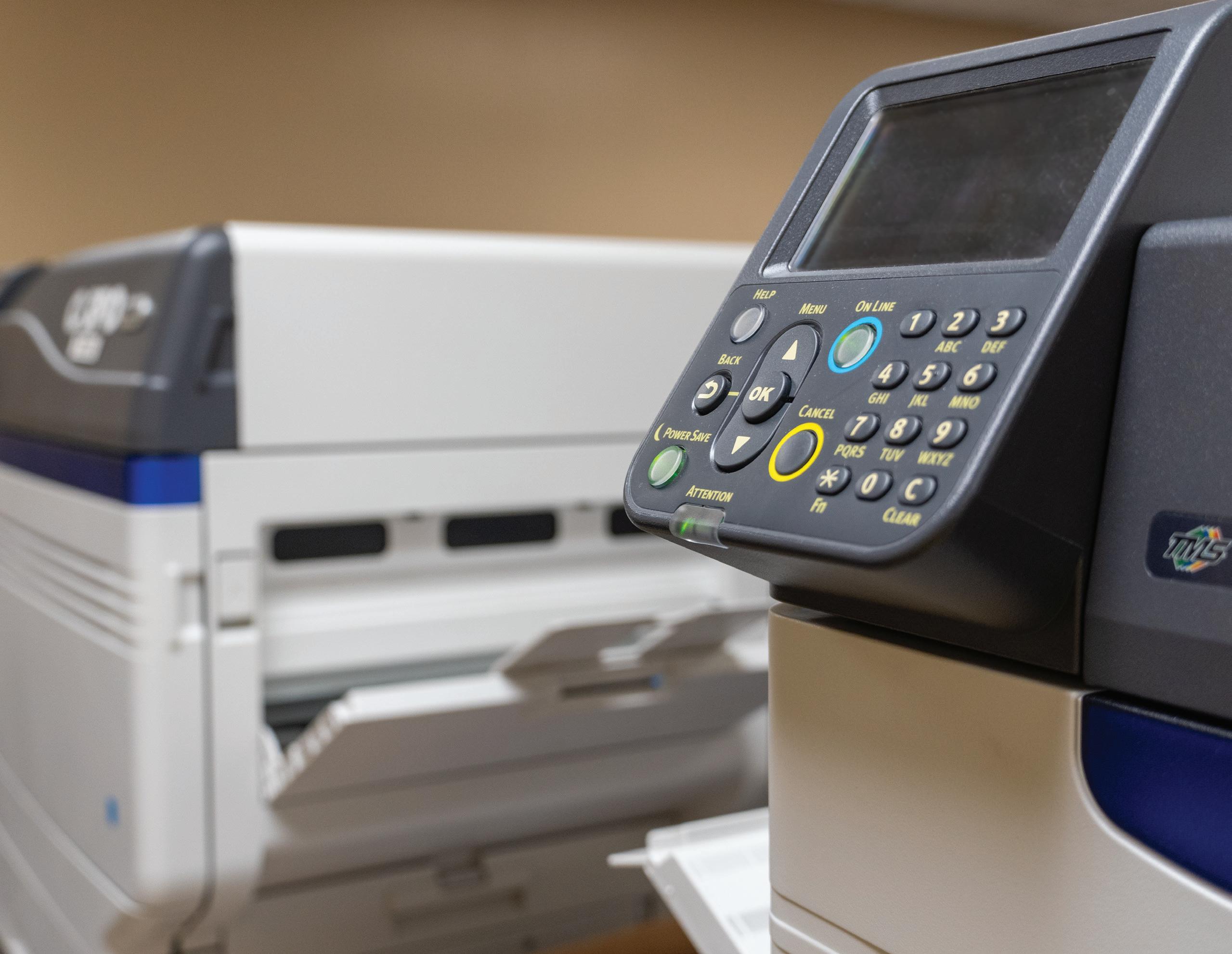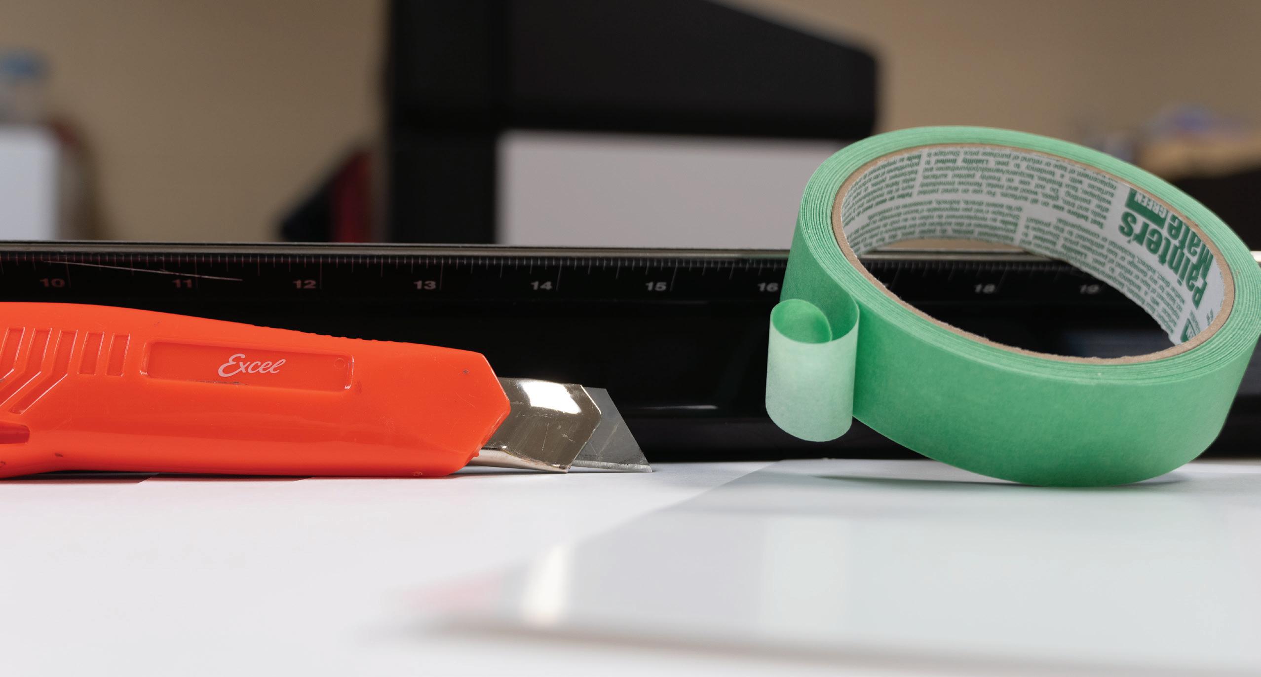 A cutting blade, ruler, and masking tape are everyday items used within a print environment.