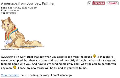 Did you know that the current “message from your pet” that users receive when one of their pound pets becomes involved in a trade is actually an edited version?