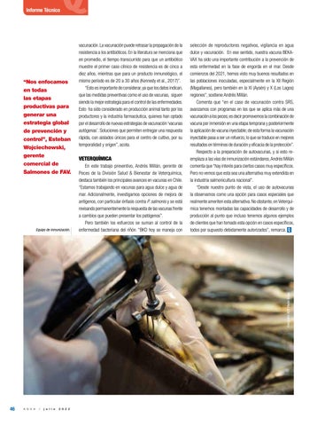 selección de reproductores negativos, vigilancia en agua dulce y vacunación. En ese sentido, nuestra vacuna BEKAVAX ha sido una importante contribución a la prevención de esta enfermedad en la fase de engorda en el mar. Desde comienzos del 2021, hemos visto muy buenos resultados en las poblaciones inoculadas, especialmente en la XII Región (Magallanes), pero también en la XI (Aysén) y X (Los Lagos) regiones”, sostiene Andrés Millán. Comenta que “en el caso de vacunación contra SRS, avanzamos con programas en los que se aplica más de una vacunación a los peces; es decir promovemos la combinación de vacuna por inmersión en una etapa temprana y posteriormente la aplicación de vacuna inyectable; de esta forma la vacunación inyectable pasa a ser un refuerzo, lo que se traduce en mejores resultados en términos de duración y eficacia de la protección”. Respecto a la preparación de autovacunas, y si esto reemplaza a las vías de inmunización estándares, Andrés Millán comenta que “hay interés para ciertos casos muy específicos. Pero no vemos que esta sea una alternativa muy extendida en la industria salmonicultura nacional”. “Desde nuestro punto de vista, el uso de autovacunas la observamos como una opción para casos especiales que realmente ameriten esta alternativa. No obstante, en Veterquímica tenemos montadas las capacidades de desarrollo y de producción al punto que incluso tenemos algunos ejemplos de clientes que han tomado esta opción en casos específicos, todos por supuesto debidamente autorizados”, remarca.
