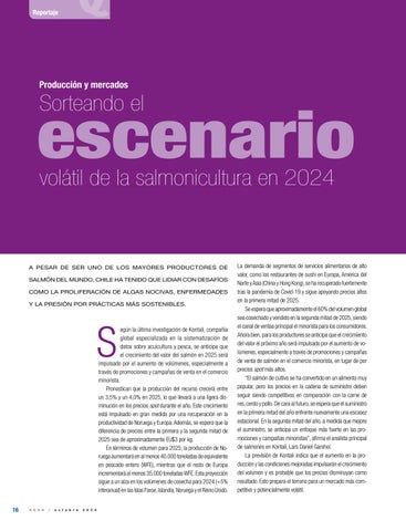 11 Salmón chileno: Desafíos y oportunidades en mercados emergentes 16 Producción y mercados: Sorteando el escenario volátil de la salmonicultura en 2024 21 Acuicultura + Pesca