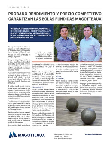 la bola fundida de bajo cromo, y desde donde se distribuye para Chile y el extranjero. “El 80% de la materia prima utilizada en la fabricación de las bolas fundidas corresponde a chatarra ferrosa, lo que nos convierte en uno de los principales recicladores de la zona central”, resalta Patricio Moreno, Gerente HSEC de Magotteaux para Chile y Perú. CÍRCULO VIRTUOSO Una vez cumplida la vida útil de bolas y revestimientos de molino, la firma ofrece a sus clientes recuperar el producto restante para volver a transformarlo en bolas fundidas, reduciendo el pasivo ambiental y mejorando los índices de sustentabilidad de las faenas mineras. “Es un círculo virtuoso, ya que mediante la economía circular generamos un producto que, finalizado su ciclo, volvemos a incorporar a nuestro proceso”, precisa Moreno.