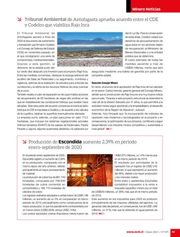 del río La Ola. Para la conservación de estas áreas, Codelco cederá sus derechos de aprovechamiento de agua dulce en los sectores objeto de recuperación al Ministerio de Bienes Nacionales o a la entidad pública que se determine. El costo estimado de todas las medidas asciende a más de US$56 millones, monto que será asegurado mediante una boleta de garantía por parte de la compañía estatal. Reacción Consejo Minero En tanto, el anuncio de la aprobación de Rajo Inca de fue valorado en el sector. Carlos Urenda, gerente general del Consejo Minero, señaló que la construcción de Rajo Inca es una muy buena noticia para el país. “Gracias a este proyecto estructural se extenderá la vida útil de la división Salvador por 47 años, lo que permitirá a la actividad minera seguir aportando a la empleabilidad y el desarrollo económico de la Región de Atacama”, subrayó. Además, hizo hincapié que “la incorporación de métodos de operación más modernos y tecnologizados en el proyecto y en consecuencia, la optimización de sus procesos, contribuirá a seguir desarrollando una industria minera competitiva y sustentable a nivel global”.