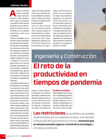 unque la industria minera ha podido seguir operando durante la crisis sanitaria, dicho logro ha implicado una serie de costos para las empresas que se desempeñan en el sector, tanto en lo referido a las compañías productoras, como a sus contratistas. “Hemos constatado que el dinamismo de las actividades de ingeniería ha sido afectado durante la crisis sanitaria. Las empresas productivas han focalizado sus esfuerzos en mantener la continuidad operativa, implementando amplias medidas de control y mitigación, las que han repercutido en el nivel de actividad de ingeniería y su productividad”, señala María Soledad Osorio, gerente de Estudios y Negocios de la Asociación de Empresas Consultoras de Ingeniería de Chile (AIC) La profesional explica que “la productividad es una variable muy relevante en las actividades de ingeniería que se mide continuamente. Esto ha permitido detectar que la crisis sanitaria ha impactado mayormente a los proyectos grandes, debido a que utilizan equipos multidisciplinarios, que requieren mayor coordinación presencial para el desarrollo de sus actividades. En el caso de proyectos menores o servicios de consultoría, hemos evidenciado que se han desarrollado con productividades adecuadas. Asimismo, los proyectos en