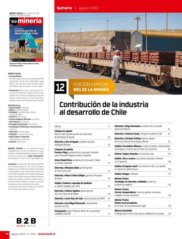 Agosto 2022 / nº 494 • www.mch.cl10 12Contribución de la industria al desarrollo de Chile MINERÍA CHILENA (M.R.) ISSN 0716-1042, Editada por: B2B MEDIA GROUP Entrevista a Miroslaw Kidon gerente general Sierra Gorda SCM Entrevista a Iván Arriagada presidente ejecutivo Antofagasta Minerals Contribuyendo al desarrollo de Chile Industria Minera: EDICIÓN ESPECIAL MES DE LA MINERÍA FUNDADA EN 1980 chilenaminería 2022agosto 494 AGO. 2022 42494 Inauguración Sistema Traspaso Andina de Codelco. Foto: Gentileza Codelco. MINERÍA CHILENA • Consejo Editorial: María Cristina Bogado, Tamara Leves, Macarena Vallejo, María Isabel González, Germán Castro, Osvaldo Pastén, Claudio Valencia, Juan David Rayo, Jacopo Seccatore, Philippe Hemmerdinger, Sergio Hernández y Francisco Costabal. • Columnistas: Marcos Gómez, gerente general de la Asociación de Industriales de Iquique, Francisco Puga, presidente de la Corporación Industrial para el Desarrollo Regional (Cidere) Coquimbo y Arturo Brandt Rivas, presidente de la Asociación Chilena de Derecho Ambiental. B2B Media Group • Gerente General: Cristián Solís • Editora: Aracelly Pérez-Kallens • Periodistas: Daniel Rojas, Mylena Jeldes y Macarena Santibáñez • Gerente TI: Oscar Sánchez • Gerente Inteligencia Mercados: Luis Ramírez • Jefe Finanzas: Alex Céspedes • Encargado Suscripciones: Rubén Villarroel • Coordinadora de Marketing y Comunicaciones: Cristina Cid • Diseño Web: Leonardo Olivares • Fotografía: Archivo B2B Media Group • Diseño Gráfico y Producción: Alejandra Barraza y Gloria Azócar • Impresión: Gráfica Andes MINERÍA CHILENA es una publicación mensual independiente, que no cuenta con patrocinios de ninguna naturaleza. La revista está disponible por suscripción, solicítela por Internet en: www.mch.cl o al Depto. Suscripciones: Rubén Villarroel, Tel.: +56 2 2757 4222, rvillarroel@b2bmg.cl