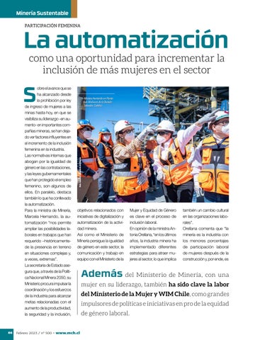 de que MINERÍA CHILENA es parte de esta nueva casa editorial, mostrando su capacidad de adaptarse y ser parte de los diversos procesos de transformación que vive el sector minero, tanto en Chile como en el mundo, persiguiendo dar visibilidad a los retos y oportunidades que presenta la principal industria de Chile, y a modo de ejemplo, cómo ha sido el progreso del incremento de la participación femenina en el sector.