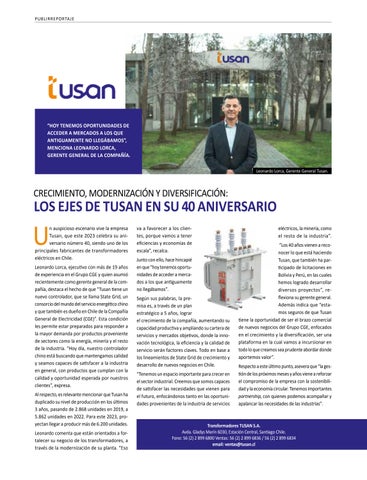 Tusan informa que Leonardo Lorca ha sido designado como Gerente General de la Compañía. El ejecutivo con más de 19 años en el Grupo CGE (perteneciente a State Grid Corporation of China), ha trabajado en diferentes áreas tanto operativas como administrativas, liderando proyectos estratégicos en CGE y tendrá la responsabilidad de llevar adelante el plan estratégico de Tusan. La premisa es, a través de un plan estratégico a 5 años, lograr el crecimiento de la compañía aumentando su capacidad productiva y ampliando su cartera de servicios y mercados objetivos, en donde la innovación tecnológica, la eficiencia y la calidad de servicio, serán factores claves. Lo anterior en base a los lineamientos de State Grid de crecimiento y desarrollo de nuevos negocios en Chile. Leonardo, es Ingeniero Comercial de la Universidad de Santiago de Chile – USACH.