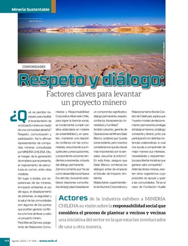 Agosto 2023 / nº 506 • www.mch.cl 6 8 MINERÍA CHILENA (M.R.) ISSN 0716-1042, Editada por: B2B MEDIA GROUP Conscientes de su rol protagónico Chile, país minero: minería chilena agosto 2023 506 Entrevista Sierra Gorda SCM: “Es necesario crear incentivos para fomentar la minería de baja ley” Evento: Nutrida jornada de exposiciones análisis marcan la Conferencia ProyectMin AGO. 2023 43 AÑO 506 Panorámica de Minera Lomas Bayas. Foto: Gentileza Glencore Chile