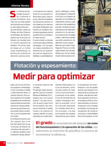 ratorio metalúrgico y centro de Investigación y Desarrollo (I+D). Esto con el objetivo de apoyarlos en los desafíos de mejoramiento continuo, pues cada día es más desafiante el procesar minerales de cobre sulfurados por las bajas leyes presentes en los yacimientos, presencia de complejas arcillas y elementos penalty que están presentes en las diferentes zonas mineras”. Mientras que Carlos Farías, Regional Product Line Manager Flotation de FLSmidth, destaca que “se han estado implementando planes inte-