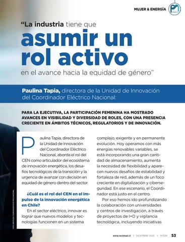 en el avance hacia la equidad de género” Paulina Tapia, directora de la Unidad de Innovación del Coordinador Eléctrico Nacional: PARA LA EJECUTIVA, LA PARTICIPACIÓN FEMENINA HA MOSTRADO AVANCES EN VISIBILIDAD Y DIVERSIDAD DE ROLES, CON UNA PRESENCIA CRECIENTE EN ÁMBITOS TÉCNICOS, REGULATORIOS Y DE INNOVACIÓN.
