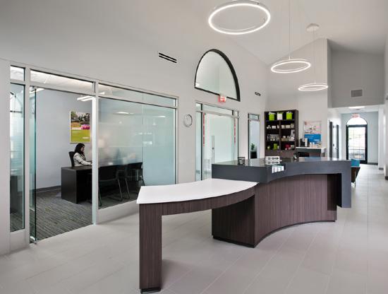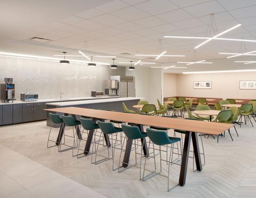 Featuring treadmills, spinning machines, free weights and more, the 24/7 fitness facilities also include showers and locker rooms to add an additional workplace benefit. The new Bistro is an inviting space for employees to congregate, eat, and socialize, with bright colors and modern dining furniture.