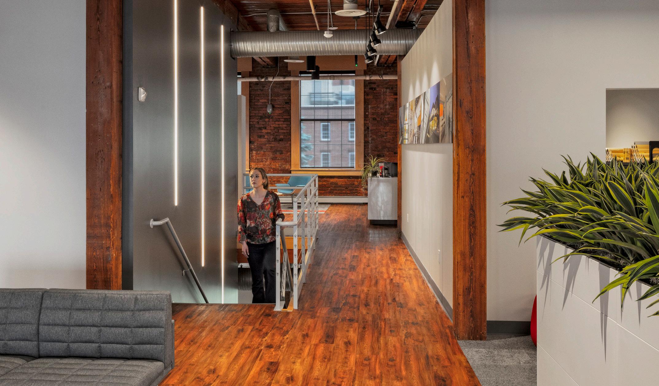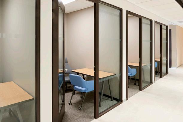 Open work areas with offices, cellular space, and meeting rooms at the core allow for maximum exposure to natural light. Transparency between spaces supports collaboration and employee well-being and promotes a forward-thinking work environment.