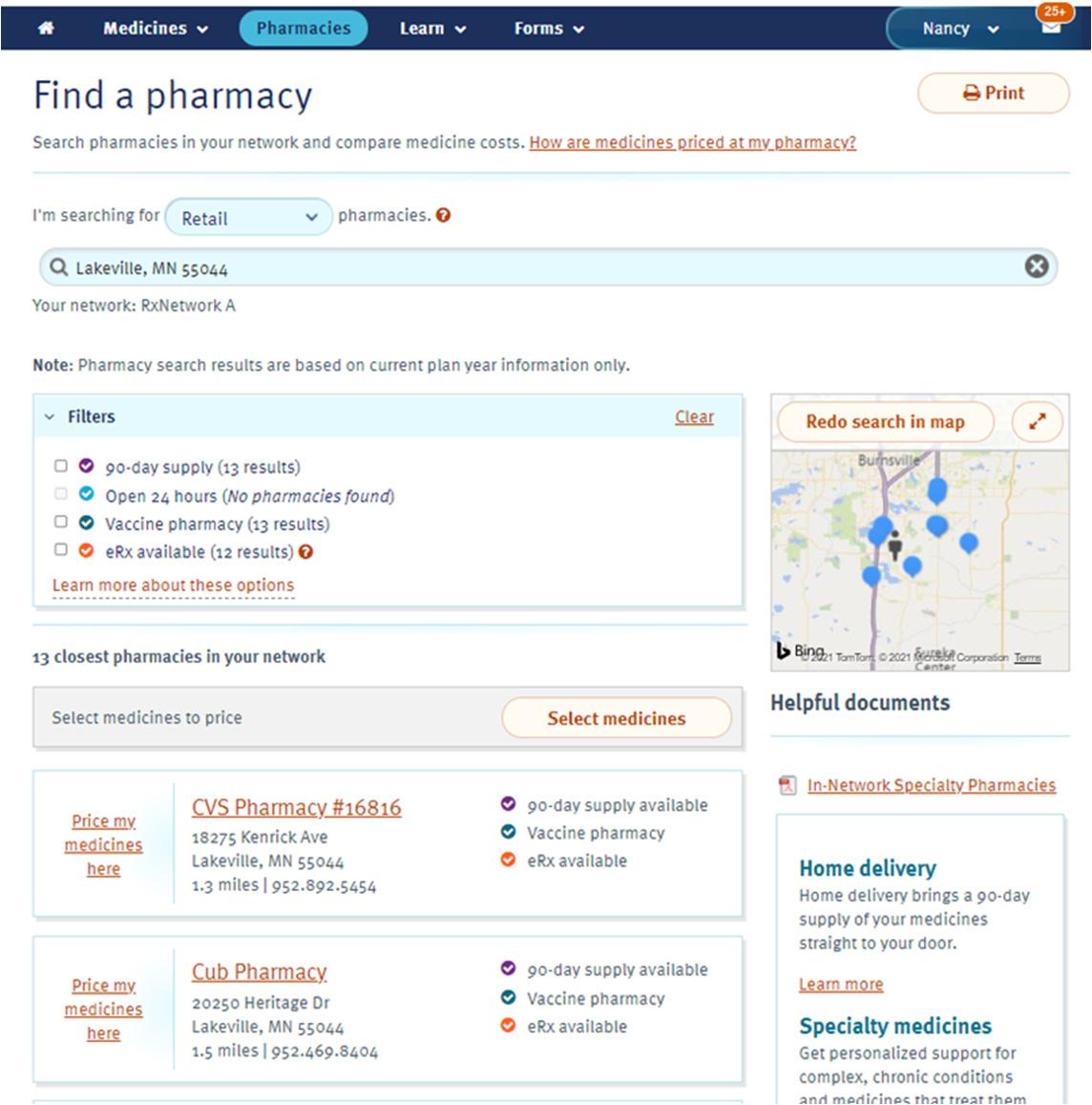 • If a member selects retail, resulting list will provide the member with up to 25 in-network retail pharmacies. Based on plan set-up, members may be able to further filter their results to search pharmacies that can provide a 30-day or 90-day supply, open 24-hours, licensed to administer vaccines onsite and fill an electronic prescription.