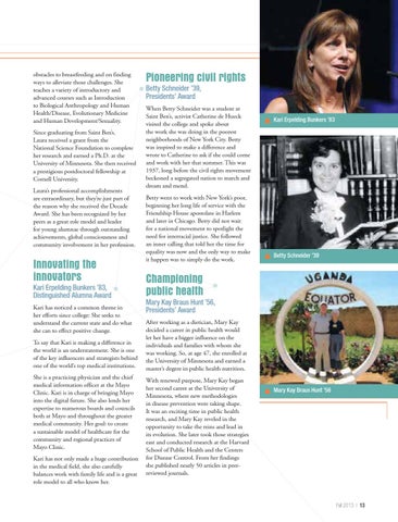 Championing public health Mary Kay Braus Hunt ’56, Presidents’ Award After working as a dietician, Mary Kay decided a career in public health would let her have a bigger influence on the individuals and families with whom she was working. So, at age 47, she enrolled at the University of Minnesota and earned a master’s degree in public health nutrition. With renewed purpose, Mary Kay began her second career at the University of Minnesota, where new methodologies in disease prevention were taking shape. It was an exciting time in public health research, and Mary Kay reveled in the opportunity to take the reins and lead in its evolution. She later took those strategies east and conducted research at the Harvard School of Public Health and the Centers for Disease Control. From her findings she published nearly 50 articles in peerreviewed journals.