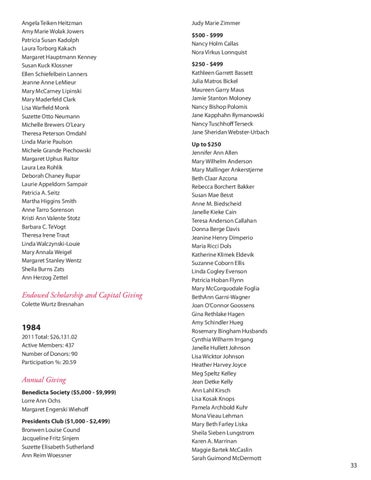 Annual Giving Benedicta Society ($5,000 - $9,999) Lorre Ann Ochs Margaret Engerski Wiehoff Presidents Club ($1,000 - $2,499) Bronwen Louise Cound Jacqueline Fritz Sinjem Suzette Elisabeth Sutherland Ann Reim Woessner