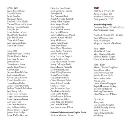 2012 Total: $17,492.72 Active Members: 463 Number of Donors: 92 Participation %: 19.87 Annual Giving Funds Luminary Society ($2,500 - $4,999) Amy Grundman Stuart President’s Club ($1,000 - $2,499) Karol O’Connor Eckel Kelly John Haugen Margrette Nemanich Newhouse $500 - $999 Maria Borash Lund Mary Elizabeth Schmidt Maureen Schulte-Wirrer Carrie McAndrew Sellner $250 - $499 Monica Pletcher Dougherty Susan Marie Eiden Jeannette Witham Hill Jennifer Eliason Hylla Kathryn Ann Kriha Pauline Maki Laurie Johnson Ringquist Angela Heineman Soukup Julie Nikolai Sullivan Sue Lang Tambornino Cheri Vermeersch Williams Up to $250 Anonymous Lisa Moonen Arrington Michele Murphy Barrett Kelly D. Boesen Kimberly Krize Bohlke Julie Brady