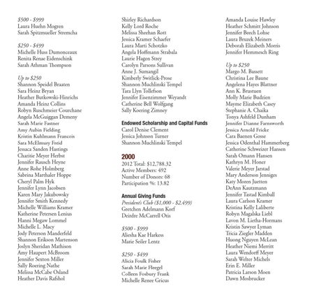 2012 Total: $12,788.32 Active Members: 492 Number of Donors: 68 Participation %: 13.82 Annual Giving Funds President’s Club ($1,000 - $2,499) Gretchen Adelmann Korf Deirdre McCarrell Otis $500 - $999 Aliesha Kae Harkess Marie Seiler Lentz $250 - $499 Alicia Foulk Fisher Sarah Marie Fleegel Colleen Fosbury Frank Michelle Renee Gricus