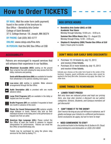 How to Order TICKETS BY MAIL: Mail the order form (with payment) found in the center of the brochure to: Box Office – Benedicta Arts Center College of Saint Benedict 37 S. College Avenue / St. Joseph, MN 56374 BY PHONE: Call (320) 363-5777 ONLINE: www.csbsju.edu/Fine-Arts IN PERSON: Visit the BAC Box Office at CSB