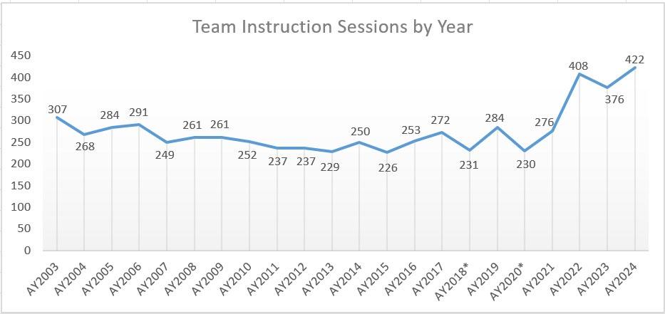 * AY2018 and AY2020 session totals do not include any sessions offered collaboratively with iTech; instead, we tracked the total unique courses/course sections – 21 and 32, respectively – collaboratively supported by librarians and iTech specialists. As a reference point, AY2019's total (284 sessions) included 101 iTech/librarian sessions across 22 courses.
