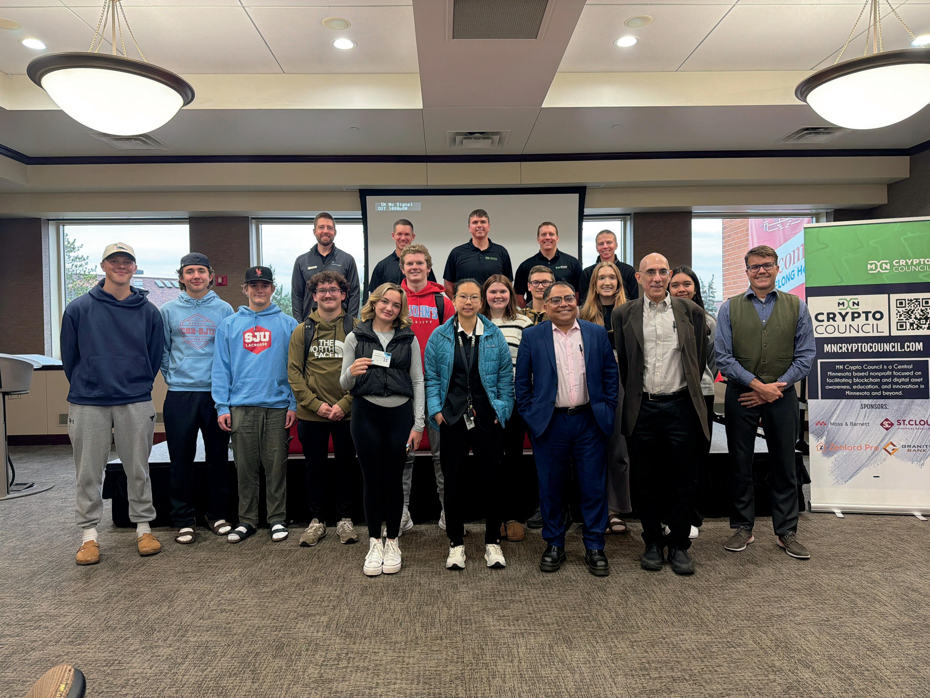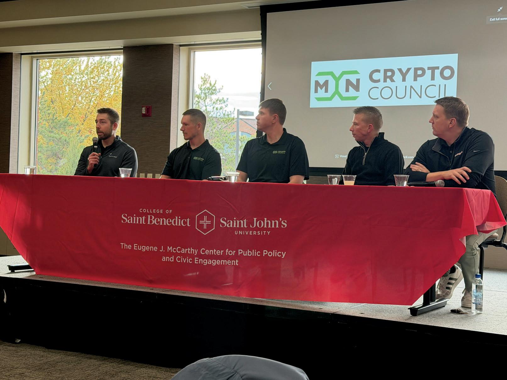 On October 28, the McCarthy Center partnered with the Economics Club to host an engaging panel discussion focused on cryptocurrency and its growing role in the future of finance The event brought together St Joseph Mayor Adam Scepaniak, SJU alumnus Alex Schoephoerster, and Chase Larson, Tony Wernsing, and Kyle Stein, all of whom serve on the board of directors for the Minnesota Crypto Council