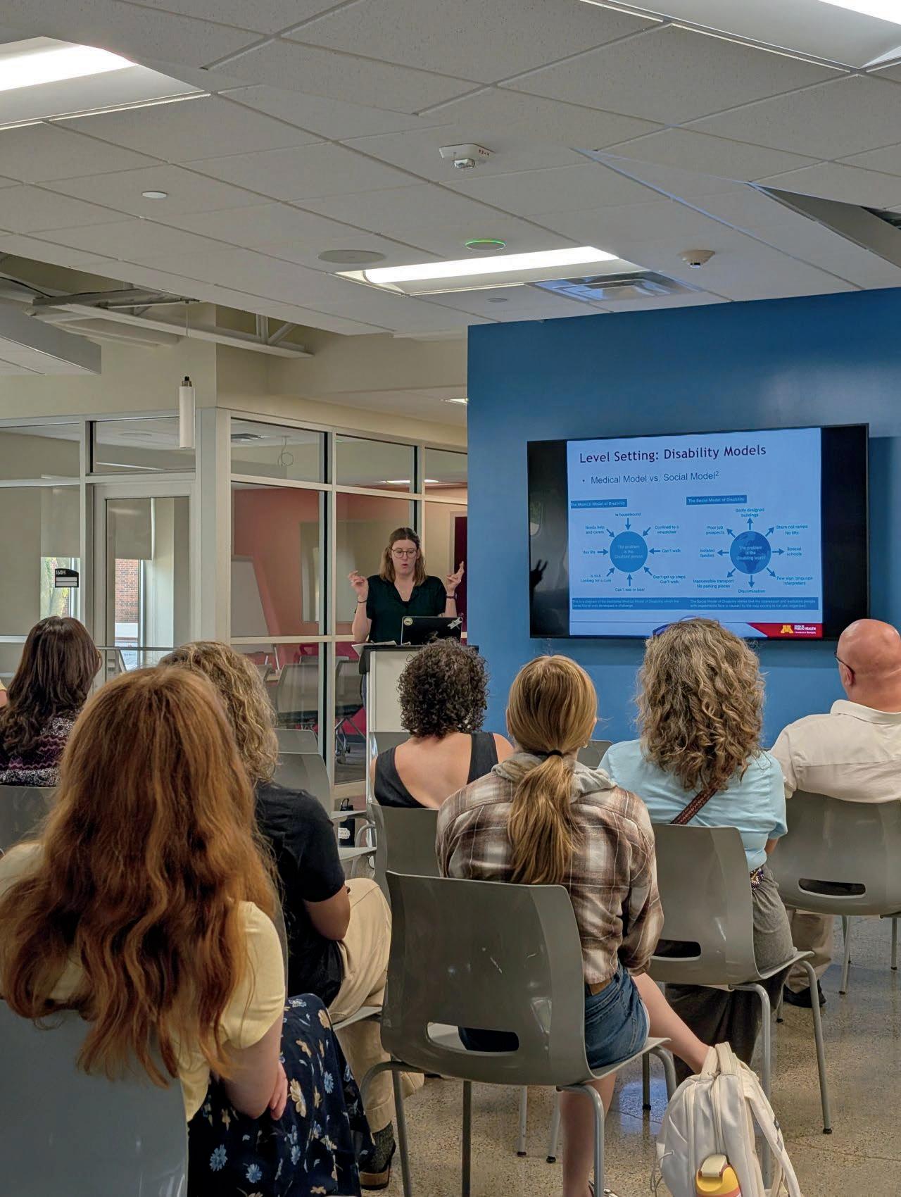 The presentation opened with an overview of the long history of oppression experienced by many individuals who experience disability She traced the ongoing struggle for equity and recognition in the United States From there, Phearman shifted to the present day, outlining the difficult reality that various forms of support, funding, and essential services are being reduced or restricted as a result of recent administrative decisions. This trend poses serious consequences for people with disabilities, whose rights and access to necessary resources are being limited across numerous states She stressed that these reductions do not simply create inconvenience They shape long term health outcomes and quality of life Phearman then turned directly to the audience, offering thoughtful and actionable ways each person can help She emphasized the importance of daily respect, intentional language, and active allyship, while also reminding attendees that they have the power to advocate for both societal and political change Even when an issue does not directly affect someone in the moment, she noted, their engagement still matters and can help shape a more equitable future She encouraged students to stay attentive to the experiences of their peers, to intervene when they witness exclusion, and to understand that allyship is an ongoing practice.