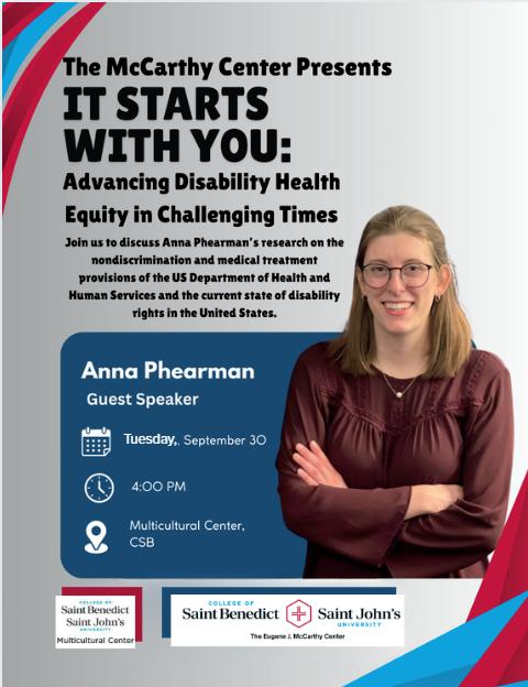 The McCarthy Center, together with the Multicultural Center, was honored to host disability advocate and speaker Anna Phearman for a powerful presentation on advancing disability health equity in challenging times. Held in the Multicultural Center, Phearman’s talk explored a wide range of issues related to the current landscape of disability equity and offered practical guidance on how attendees can advocate, raise awareness, and support meaningful change Her approach blended personal experience, historical context, and policy insight, which helped the audience understand both the human impact and the broader systemic challenges at play