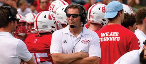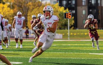 TD FOR THE DL Senior All-American defensive lineman Zach Frank recorded four tackles, including half a tackle for loss, in the Johnnies’ road win at Concordia. A rare sighting on offense, however, showcased Frank’s pass-catching ability and his first collegiate touchdown – a two-yard toss from Feeney – in the fourth quarter. He caught two passes for 33 yards last season, but was held out of the end zone. A semifinalist for the 2025 William V. Campbell Trophy and a candidate for the 2025 National Football Foundation (NFF) Scholar-Athlete Awards, Frank has 97 tackles (50 solo), including 32.5 tackles for a loss, 22.0 sacks, 16 quarterback hurries, two forced fumbles and one fumble recovery in 37 career games. The 22 sacks tie him with his defensive line coach, Damien Dumonceaux ’06, and Nick Gunderson ’09 for eighth in program history.