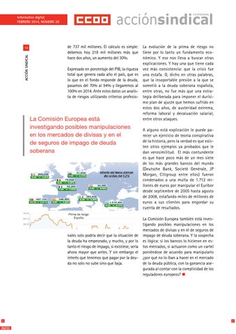 La evolución de la prima de riesgo no tiene por lo tanto un fundamento económico. Y eso nos lleva a buscar otras explicaciones. Y hay una que tiene cada vez más consistencia: que la crisis fue una estafa. O, dicho en otras palabras, que la insoportable presión a la que se sometió a la deuda soberana española, entre otras, no fue más que una estrategia deliberada para imponer el durísimo plan de ajuste que hemos sufrido en estos dos años, de austeridad extrema, reforma laboral y devaluación salarial, entre otros ataques. A alguno está explicación le puede parecer un ejercicio de teoría conspirativa de la historia, pero la verdad es que existen otros ejemplos ya probados que le dan verosimilitud. El más contundente es que hace poco más de un mes siete de los más grandes bancos del mundo (Deutsche Bank, Societé Genérale, JP Morgan, Citigroup entre ellos) fueron condenados a una multa de 1.712 millones de euros por manipular el Euribor desde septiembre de 2005 hasta agosto de 2008, estafando miles de millones de euros a sus clientes para engordar su cuenta de resultados. La Comisión Europea también está investigando posibles manipulaciones en los mercados de divisas y en el de seguros de impago de deuda soberana. Y la sospecha es lógica: si los bancos lo hicieron en estos mercados, si actuaron como un cartel poniéndose de acuerdo para manipularlo ¿por qué no lo iban a hacer en el mercado de la deuda pública, con la ganancia asegurada al contar con la complicidad de los reguladores europeos? n