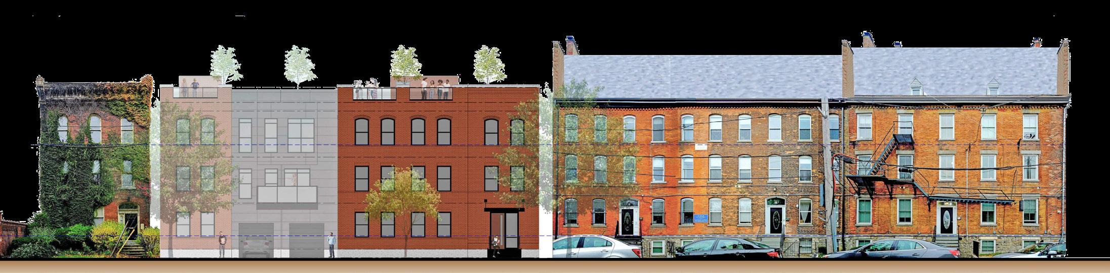 St Louis Place, is a quaint, tucked away street in the theatre district of Buffalo NY. Adjacent to the site, is a historic three-story brick building, which is historically significant. The Historic Preservation Board of Buffalo, required a detailed study of the horizontal lines and fenestration shape, size and configuration, so they could be applied to the massing, shape and configuration of the proposed new townhome project. Brownfield tax credits were used to fund the project.