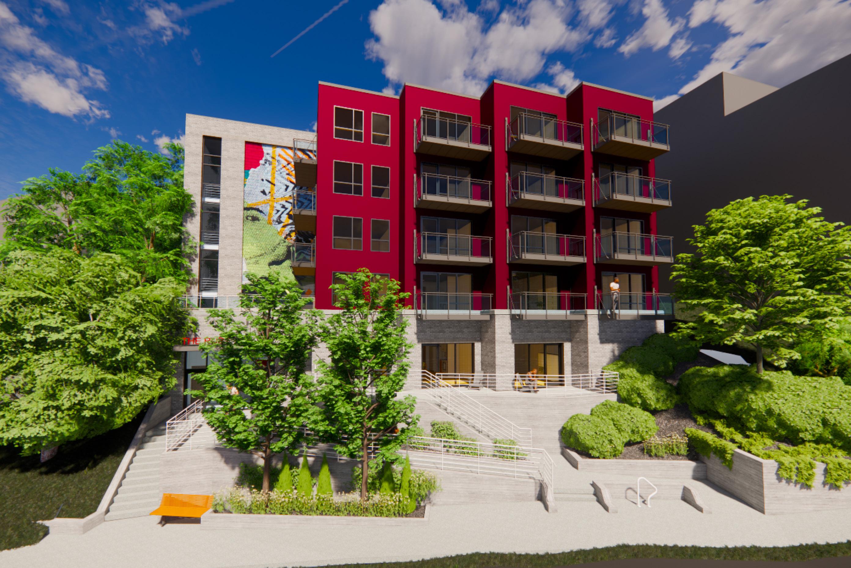 The Ruby is a bold new addition to the neighborhood, designed to bring vibrancy, energy, and contemporary student living to the heart of the community. This four-story, 25,817 GSF residential building sits gracefully atop a concrete plinth, skillfully responding to the site’s challenging grade change by stepping into the hillside. The result is a dynamic form that not only meets functional needs but also enhances the streetscape. Inside, The Ruby offers 40 efficient studio units thoughtfully designed for student lifestyles. Each home balances privacy and independence with access to shared outdoor and communal spaces. The building’s front patio opens directly to the street, creating an active, welcoming edge where residents and neighbors can connect. A highlight of the project is a striking mural by a local artist, celebrating creativity and anchoring the building as a cultural landmark. The mural transforms The Ruby’s façade into a canvas that reflects the spirit of the community, ensuring the project is more than just housing—it’s a point of pride. Through careful design and collaboration, The Ruby demonstrates how modern housing can blend function, art, and context, creating a lasting impact on the neighborhood while offering students a vibrant place to live and thrive.