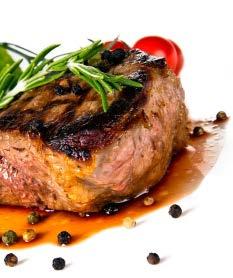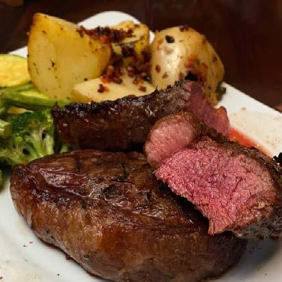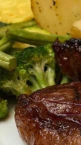 Filete de res servido con demi glasse de vino tinto, champiñones, verduras al vapor y puré de papa.