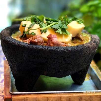 Molcajete en salsa de tomatillo de milpa acompañado de nopales asados, cebollitas cambray, queso mozzarella y tortillas recién hechas.