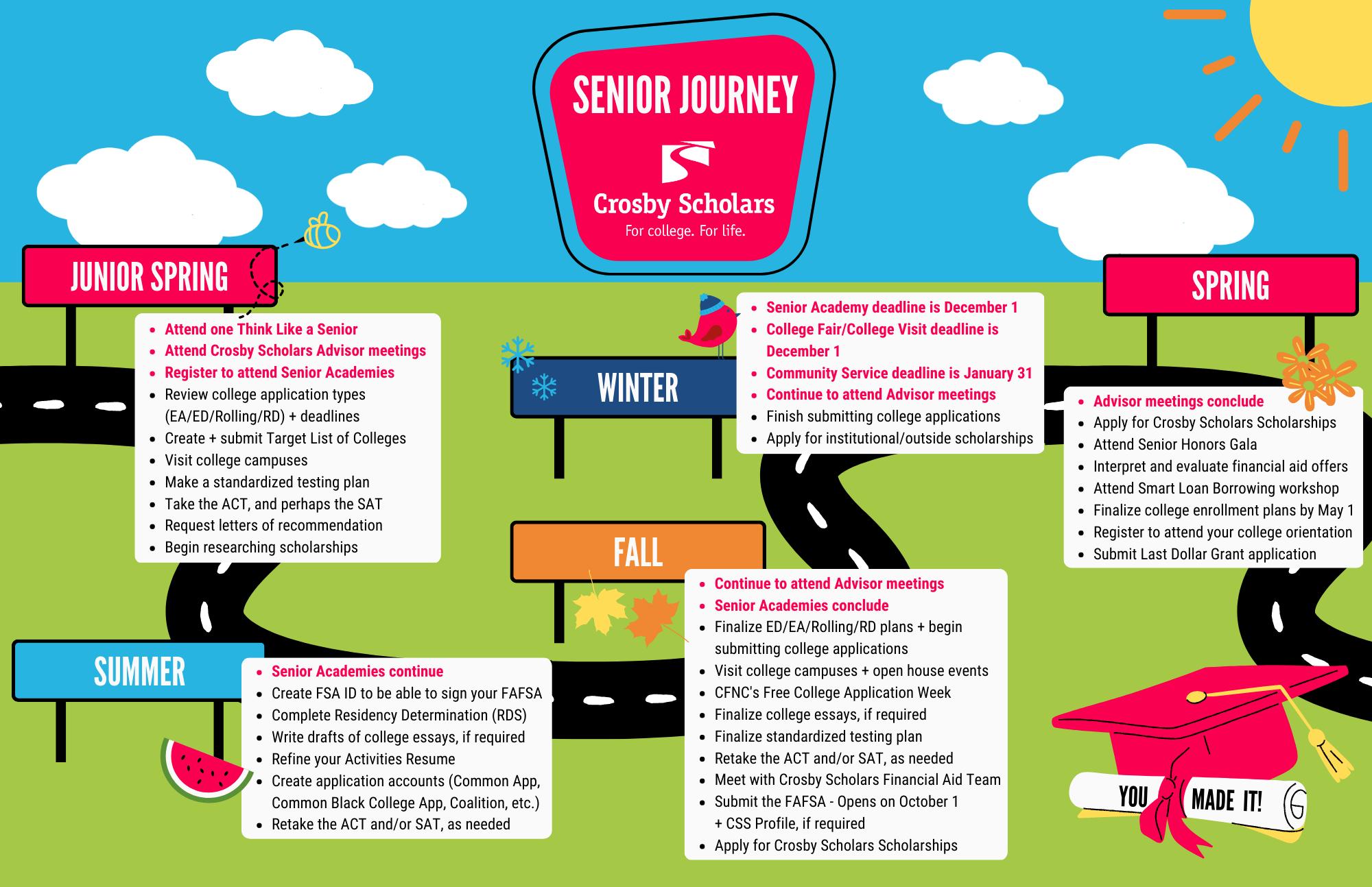Crosby Advisor open family dialogue identify red flags stay aware of dates regional Admissions rep set calendar reminders follow official social media listen to podcasts call Admissions office campus tours live chat options create priorities