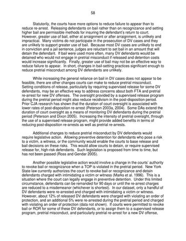 58 Statutorily, the courts have more options to reduce failure to appear than to reduce re-arrest. Releasing defendants on bail rather than on recognizance and setting higher bail are permissible methods for insuring the defendant’s return to court. However, greater use of bail, either at arraignment or after arraignment, is unlikely and impractical. Many victims do not participate in the prosecution of DV cases and they are unlikely to support greater use of bail. Because most DV cases are unlikely to end in conviction and a jail sentence, judges are reluctant to set bail in an amount that will detain the defendant. If bail were used more often, many DV defendants would be detained who would not engage in pretrial misconduct if released and detention costs would increase significantly. Finally, greater use of bail may not be an effective way to reduce failure to appear. In short, changes in bail-setting practices significant enough to reduce pretrial misconduct among DV defendants are unlikely. While increasing the general reliance on bail in DV cases does not appear to be feasible, there are other changes courts can make to reduce pretrial misconduct. Setting conditions of release, particularly by requiring supervised release for some DV defendants, may be an effective way to address concerns about both FTA and pretrial re-arrest for new DV offenses. The oversight provided by a supervised release program during the pretrial period might also reduce recidivism in the post-disposition period. Prior CJA research has shown that the duration of court oversight is associated with lower rates of post-disposition re-arrest (Peterson 2003a, 2004). Some DAs extend the duration of court oversight as a means of monitoring DV defendants during the pretrial period (Peterson and Dixon 2005). Increasing the intensity of pretrial oversight, through the use of a supervised release program, might provide added benefits in terms of reducing post-disposition re-arrests as well as pretrial re-arrests. Additional changes to reduce pretrial misconduct by DV defendants would require legislative action. Allowing preventive detention for defendants who pose a risk to a victim, a witness, or the community would enable the courts to base release and bail decisions on these risks. This would allow courts to detain, or require supervised release for, high-risk defendants. Such legislation is proposed from time to time, but has not been passed (Ross and Gendar 2005). Another possible legislative action would involve a change in the courts’ authority to revoke bail or recognizance when a TOP is violated in the pretrial period. New York State law currently authorizes the court to revoke bail or recognizance and detain defendants charged with intimidating a victim or witness (Marks et al. 1996). This is a situation where the court can legally engage in preventive detention. Under this limited circumstance, defendants can be remanded for 90 days or until the re-arrest charges are reduced to a misdemeanor (whichever is shortest). In our dataset, only a handful of DV defendants were re-arrested and charged with intimidating a victim or witness. However, about 12% of released DV defendants were charged with violating an order of protection, and an additional 5% were re-arrested during the pretrial period and charged with violating an order of protection (data not shown). If courts were permitted to revoke bail or ROR for some of these DV defendants, or to assign them to a supervised release program, pretrial misconduct, and particularly pretrial re-arrest for a new DV offense,