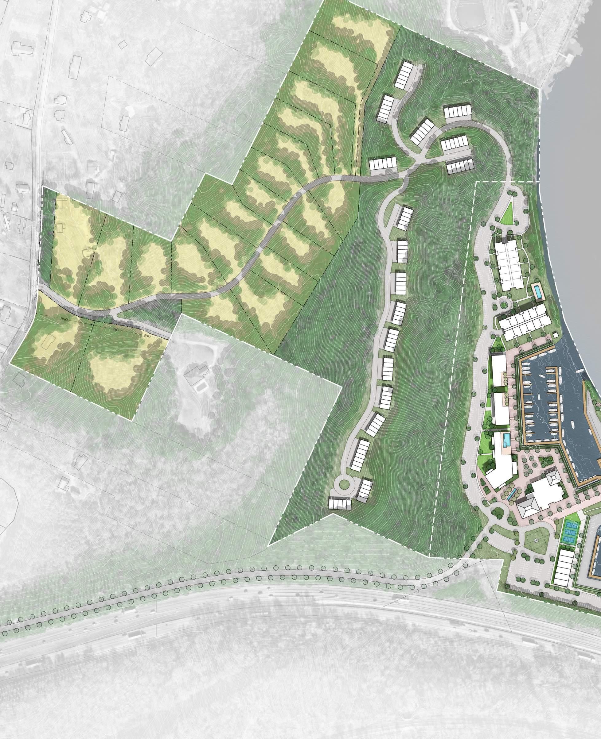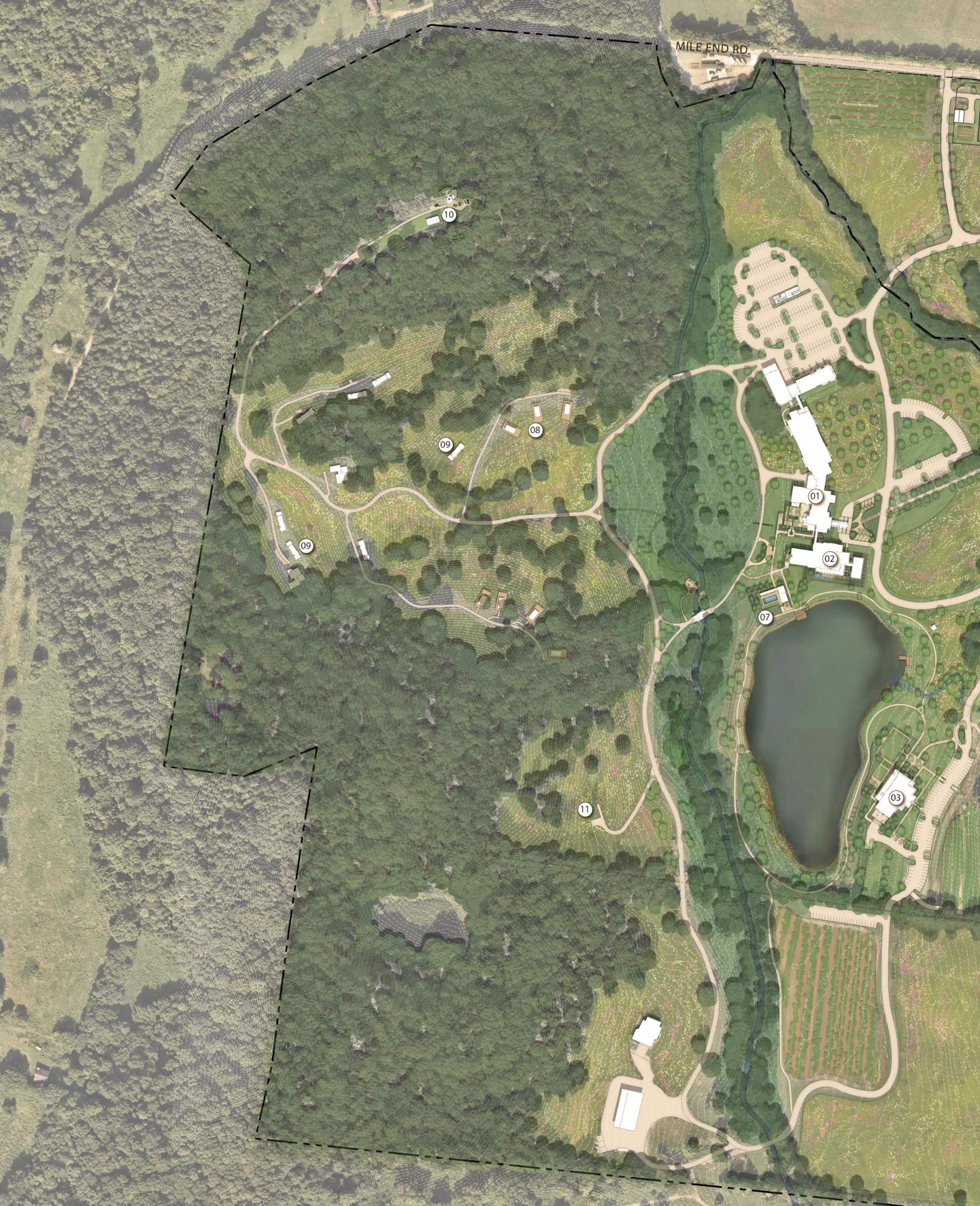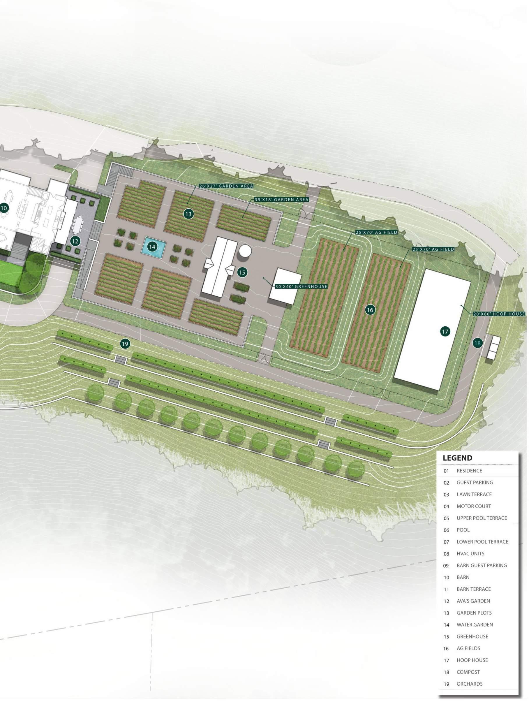 CSDG was approached by the property owners of a 76-acre property in the rolling hills of Leiper’s Fork to help masterplan a private working farmstead for the family. The property owner’s passion for organic farming, livestock, entertaining and creating a community based around agriculture is reflected in the design. Entertaining spaces spill out into the agricultural areas as well as take in views of the surrounding hillside. The design includes dwellings for a homesite as well as two working barns, a production garden area, greenhouses, and an orchard. The orchard now has over 120 fruit trees on terraces rolling down the property towards the existing tree canopy. The house and guest house have multiple entertaining spaces which include fire pit terraces, outdoor kitchens, and a pool that capitalizes on some of the main views of the property. Across the hill sits an artificial turf golf practice area that can be played from multiple tee boxes, a hilltop overlook deck and a clay shoot area. The property is currently under construction.