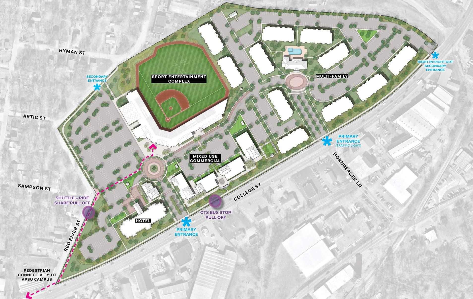 A rezoning of 30 acres of land from industrial to mixed-use planned unit development will mean a “revival” to this area in Clarksville. The vision for the Vulcan Mixed Use and Entertainment District includes a brand hotel, performance venues, a new baseball stadium, a variety of retail and dining, as well as residential living. CSDG is proud to provide Planning, Landscape Architecture, and Civil Engineering for this project, working with developer, VP Riverside Development, and Stadium Architect, McMillan Pazdan Smith. The design plan will transform this area that has sat vacant for four years, yielding employment opportunities, more attainable housing, and entertainment to draw visitors, dramatically improving the overall vitality of the district.