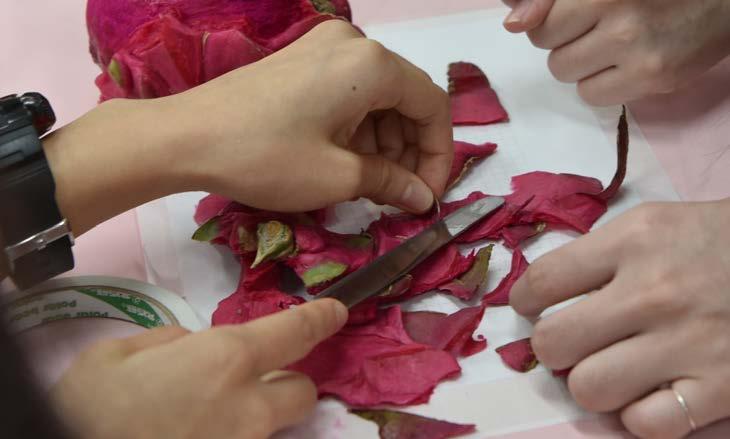 我們準備用水彩調配出跟火龍果相關的顏色。我們在圓點貼紙上剪出小洞,貼到火龍果上,從鏤空的洞穿透出的顏色就是我們要調的顏色。我們各自負責調配不同的顏色,和同學互相交換後,形成了二十張繽紛火龍果色票的排列。我起初想將收到的色票按照相近色的順序排列,隨後發現那是不可能的任務。因為,就算範圍限定在「火龍果表皮會出現的顏色」,我仍不知道自己會確切收到什麼顏色。猶如人生,也因為擁有這種不確定性,才會顯得多采多姿。