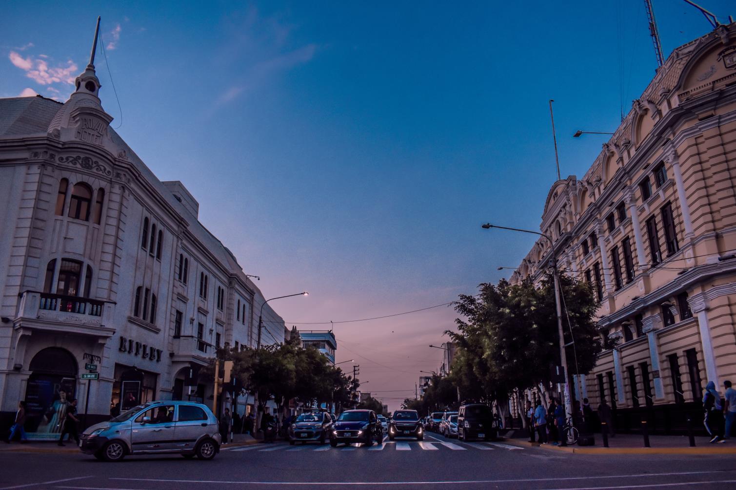 Mientras el sol cae , ilumina la intersección donde el tráfico y las personas convergen en el corazón comercial de Chiclayo. Los edificios históricos enmarcan un paisaje urbano lleno de vida y actividad constante