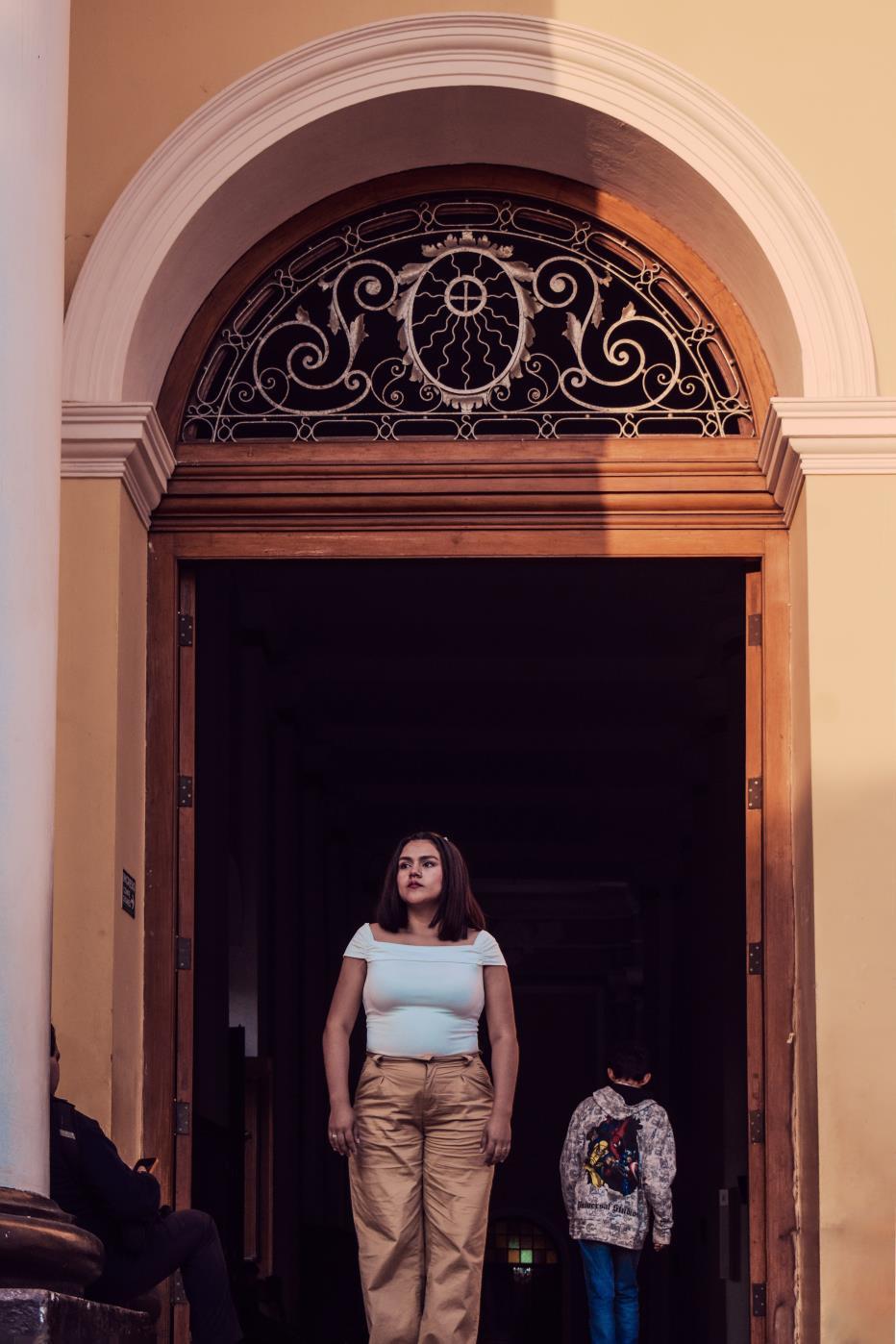 Una joven q emerge de la iglesia mientras un niño ingresa simbolizando la confluencia de lo divino y lo terrenal. La impresionante arquitectura religiosa con una entrada que enmarca este momento de transición, resaltando cómo la espiritualidad y la belleza arquitectónica se entrelazan, ofreciendo refugio y reflexión en medio de la vida moderna